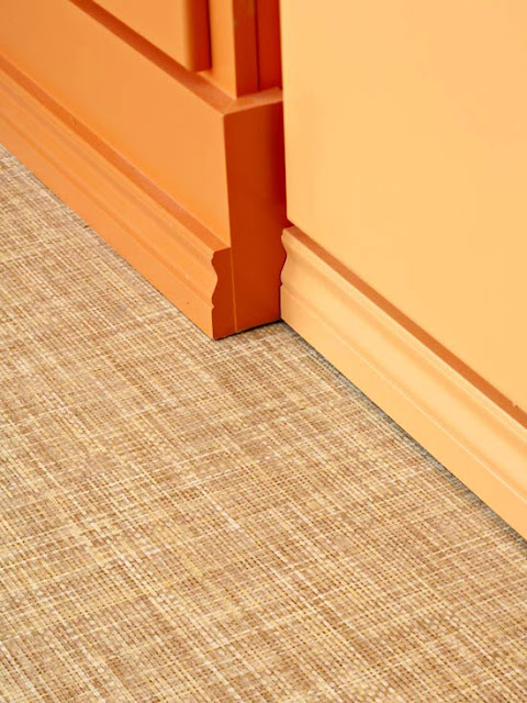 These storage units looked awfully plain before the homeowner/designer got her hands on them. First, she and her husband found three unfinished wood cabinets. They added molding to give the pieces architectural interest, then painted them in their favorite orange hues. She used frosted window film to create the diamond designs on the glass cabinet doors. Pretty curtains suspended from tension rods give the cabinets a soft look.