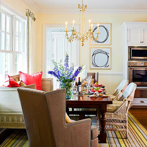 A reproduction of an antique chandelier hangs above the table, and a striped cotton area rug provides warmth and softness underfoot while helping to define the dining area.